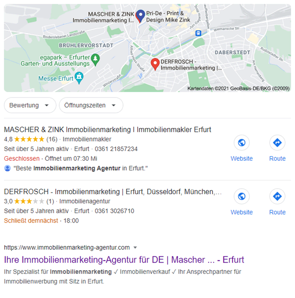 Schon nach kurzer Zeit konnte die Sichtbarkeit von Mascher & Zink in den Google-Suchergebnissen deutlich verbessert werden. So wurde bei der Keyword-Kombination „Immobilienmarketing Agentur” die Top-Platzierung im Ranking erreicht. Zudem konnten Top-Platzierungen bei der Google-Suche für den Bereich lokaler Unternehmen in Erfurt erzielt werden.